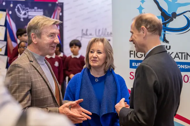 سر کریستوفر دین (چپ)، دوک ادینبورگ (وسط) و کارن باربر، مربی (راست)، در مسابقات قهرمانی اسکیت نمایشی اروپا ۲۰۲۶ فدراسیون بین‌المللی اسکیت (ISU) در شفیلد، انگلستان. © ISU